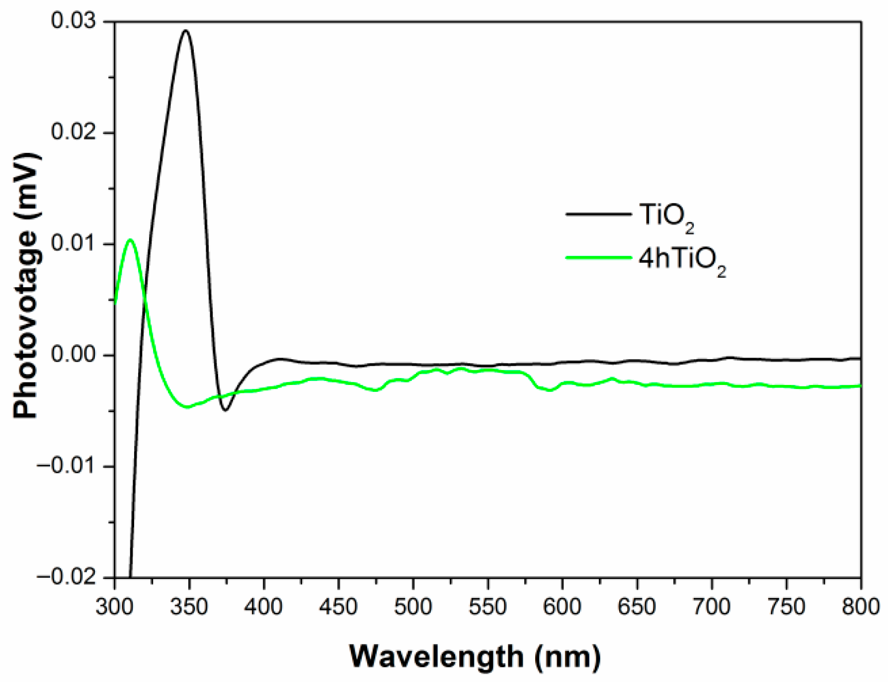 The presence of defect states and surface states creates temporary intermediate energy levels within the band gap. Under light irradiation, charge transitions between the valence band, these intermediate states, and the conduction band generate the observed photocurrent response. The broad SPV response of 4hTiO2 indicates that the increased surface defects and impurities facilitate the generation of intermediate energy levels, promoting charge carrier excitation and improving the photocatalytic activity over a wider range of the electromagnetic spectrum.