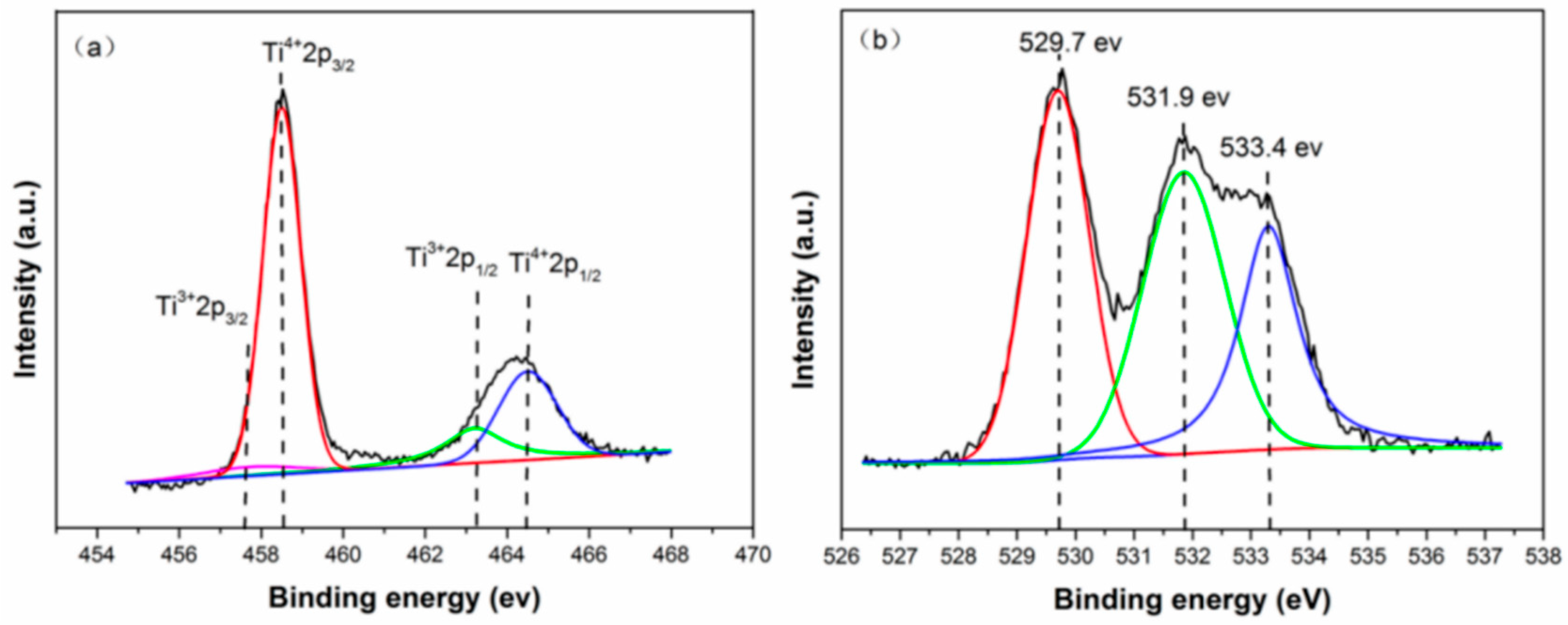 Figure 7 shows the Ti 2p (a) and O 1s (b) X-ray photoelectron spectroscopy (XPS) spectra of the 4hTiO