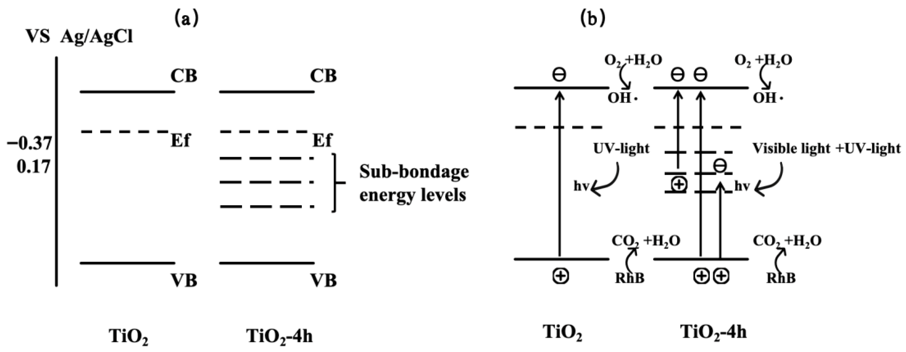 These findings demonstrate that the vacuum high-temperature treatment significantly influences the surface properties and electronic structure of TiO2, leading to an enhanced photocatalytic performance due to the increased surface states and the associated charge carrier dynamics.