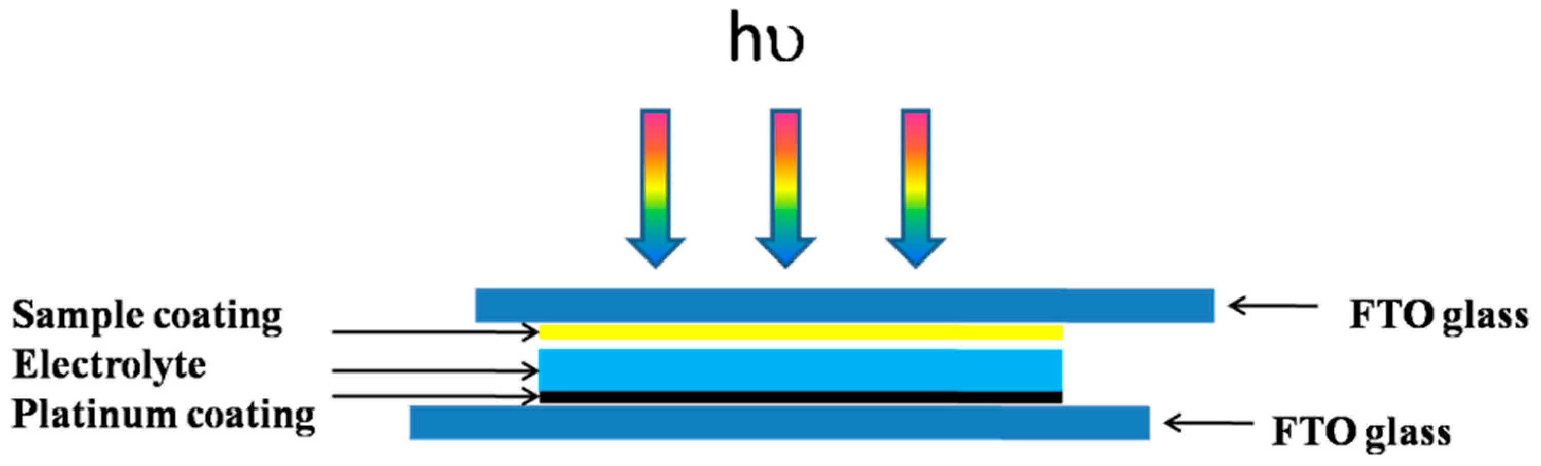 − electrolyte solution was injected between the two electrodes using a 50 μL micropipette. The working electrode, which contained the sample, was positioned between the FTO conductive glass, while the reference electrode and counter electrode were attached to the platinum electrode. The system was exposed to light from a xenon lamp, with the light intensity adjusted to 100 mW·cm