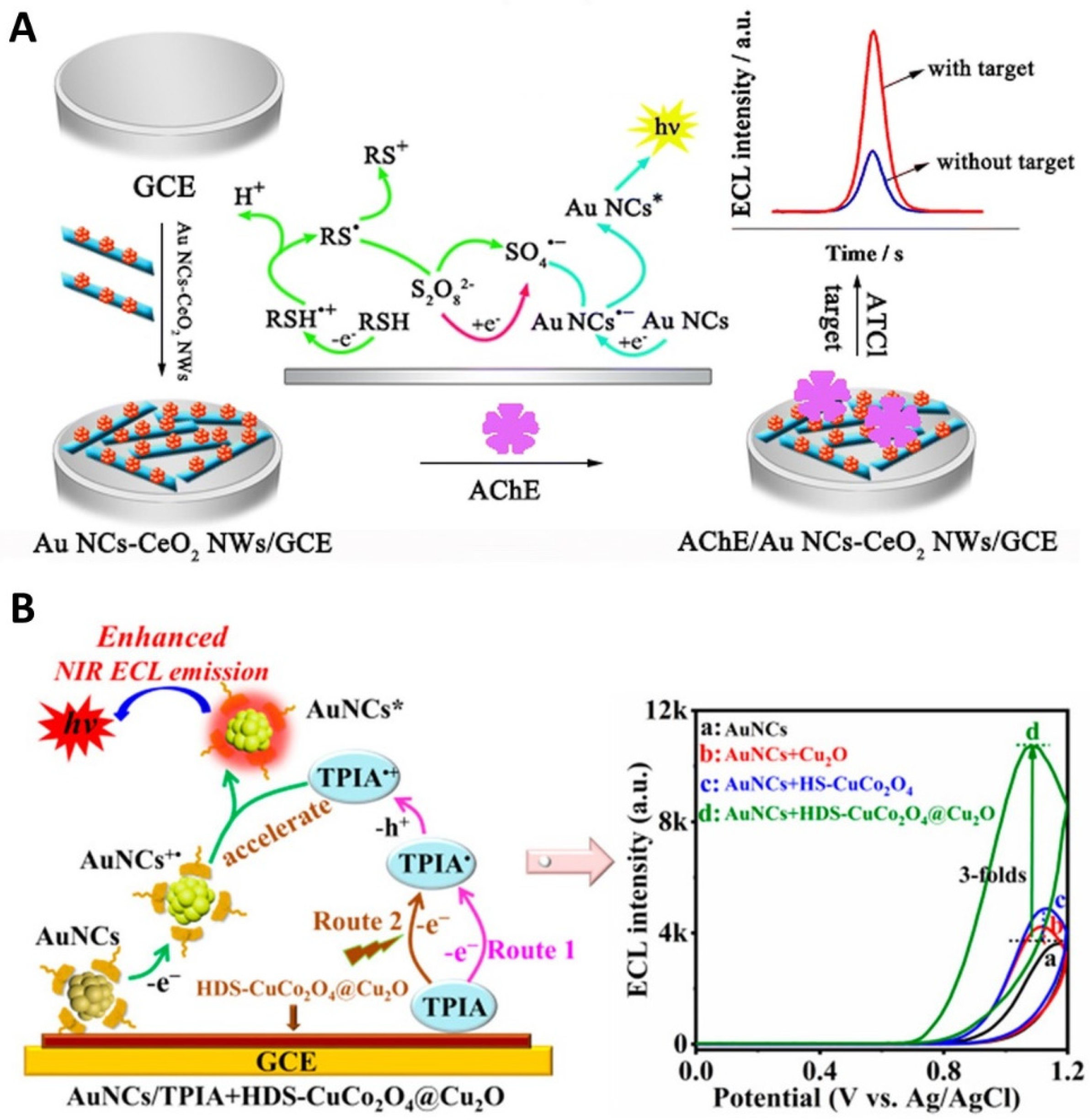 - Guo, W.; Xia, M.; Peng, D.; Zhao, Y.; Nie, Y.; Zhou, Y. Co-Reactive Ligand In Situ Engineered Gold Nanoclusters with Ultra-Bright Near-Infrared Electrochemiluminescence for Ultrasensitive and Label-Free Detection of Carboxylesterase Activity. Anal. Chem. 2024, 96, 2369–2377. [Google Scholar] [CrossRef] [PubMed]
