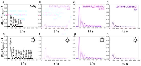Figure 2. Comparison of sensing responses toward acetone of pristine (a,e) SnO2 and (bd,fh) ZnTPPF20CN/SnO2-based composites in simulated air (80% N2–20% O2), both in dark and upon LED light illumination. Operating temperature = 120 °C, RH% < 2%.