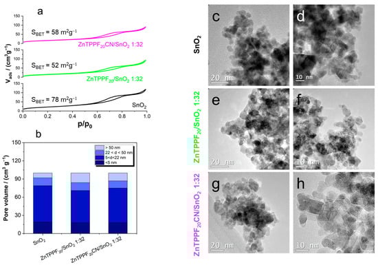 We conducted a comprehensive characterization of the best-performing ZnTPPF20CN/SnO2 composite to have a meaningful comparison with pristine SnO2 and the ZnTPPF20/SnO2 hybrid. Figure 4a displays the nitrogen adsorption–desorption isotherms of pristine SnO2, ZnTPPF20/SnO2 1:32, and ZnTPPF20-CN/SnO2 1:32 composites, respectively.