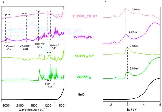 The optical characterizations were carried out by attenuated total reflectance–Fourier transform infrared (ATR-FTIR) spectroscopy and Diffuse reflectance spectroscopy (DRS). Subtraction of the spectrum of pure SnO2 from that of the hybrid allowed us to evidence the contribution of the porphyrins alone (“ZnTPPF20CN diff” and “ZnTPPF20 diff” patterns in Figure 5a). The comparison of the differential spectra with those of pristine porphyrins helped us to gain insight into porphyrin–SnO2 interaction.