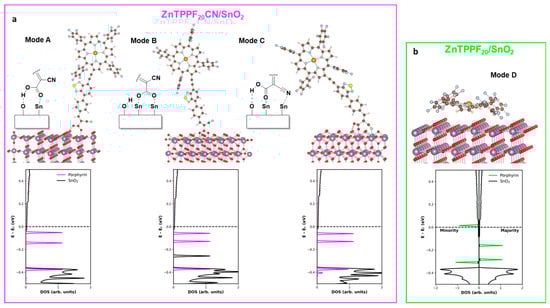 ZnTPPF20CN can exist in at least two configurational isomers, Z and E, arising from the rigid rotation around the C=C double bond of the side chain (Figure S5, Charts S1 and S2). Both isomers were optimized with the SIESTA code, revealing that the E-isomer is more stable with an energy difference of 0.26 eV. According to a Boltzmann distribution, the probability of the E-isomer being present under thermodynamic control at room temperature exceeds 99%. This result is further supported by literature findings, according to which the E-isomer is the predominant product in the Knoevenagel condensation [40]. However, to account for potential reconfiguration mechanisms that may occur upon interaction with the surface, the adsorption of both isomers on the SnO2 surface was examined. To assess how the presence of the pendant group may affect the adsorption pathway and, thus, potentially influence the overall performance of the system, three different adsorption modes of the ZnTPPF20CN were hypothesized (Figure 6a).