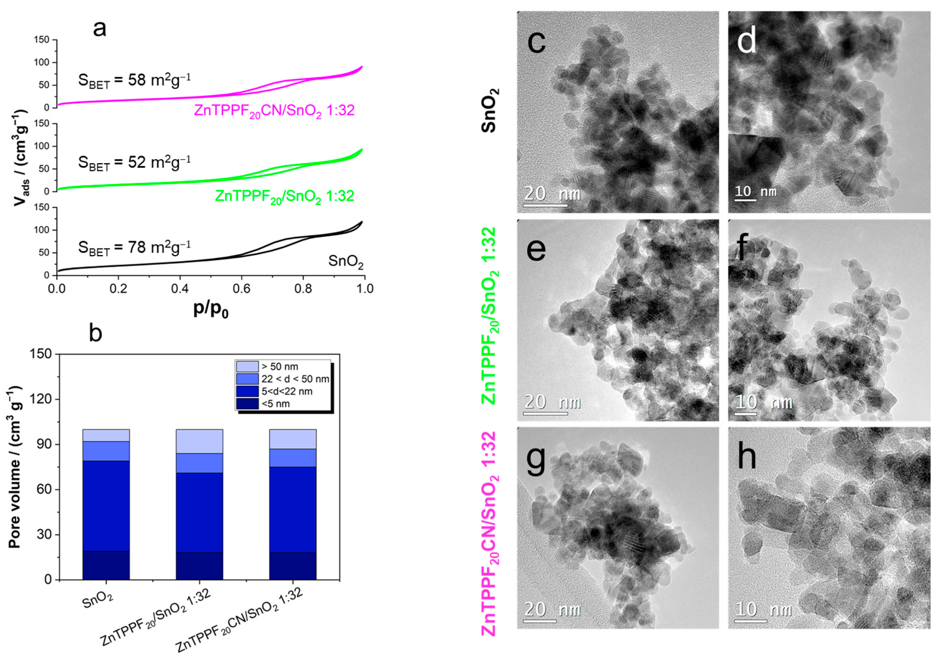 Figure 4. (a) BET isotherms and (b) pore distribution by BJH analysis. HRTEM images of (c,d) SnO2, (e,f) ZnTPPF20/SnO2, and (g,h) ZnTPPF20CN/SnO2 composites.