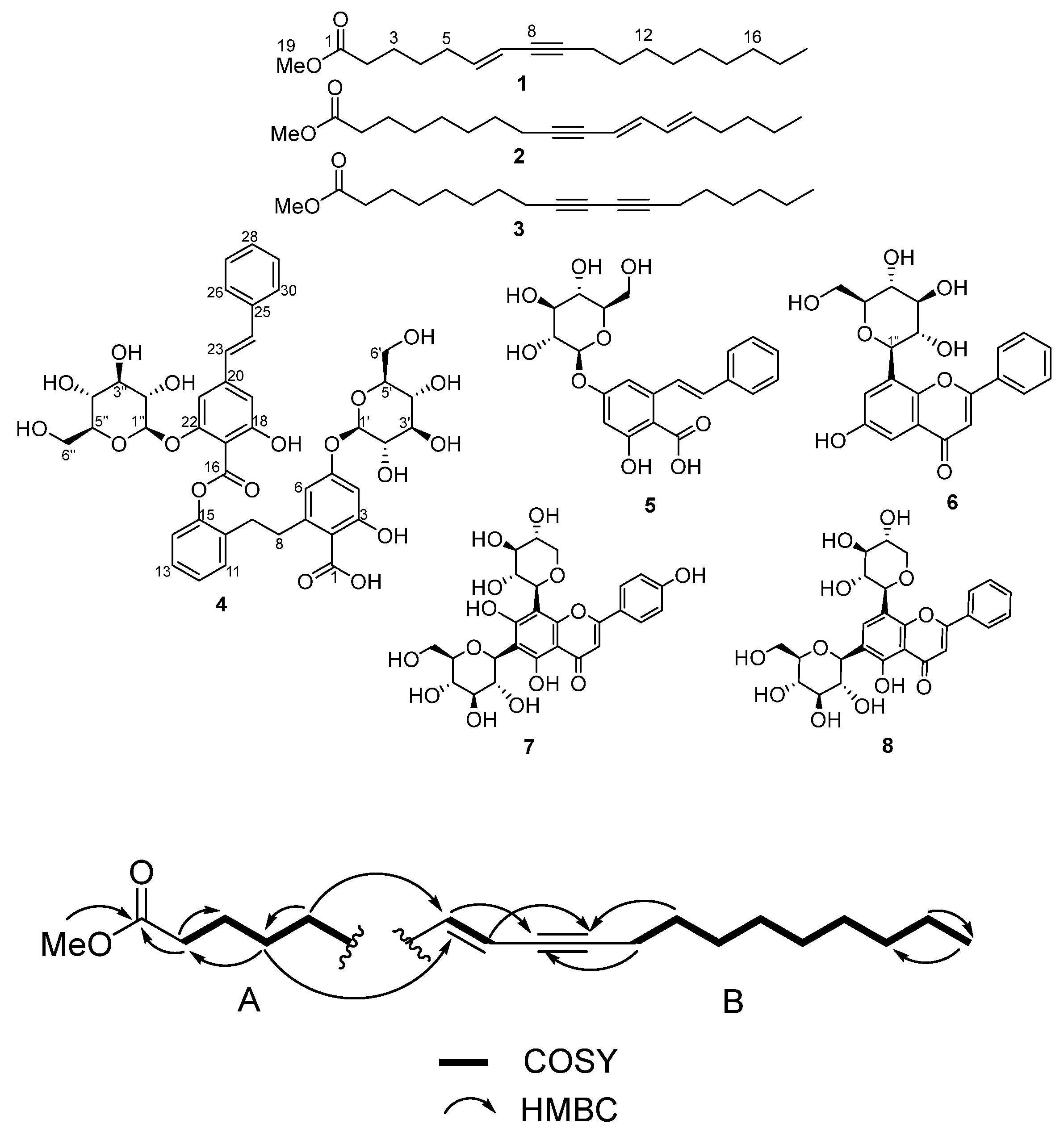 - El-Jaber, N.; Estévez-Braun, A.; Ravelo, A.G.; Muñoz-Muñoz, O.; Rodríguez-Afonso, A.; Murguia, J.R. Acetylenic Acids from the Aerial Parts of Nanodea muscosa. J. Nat. Prod. 2003, 66, 722–724. [Google Scholar] [CrossRef]