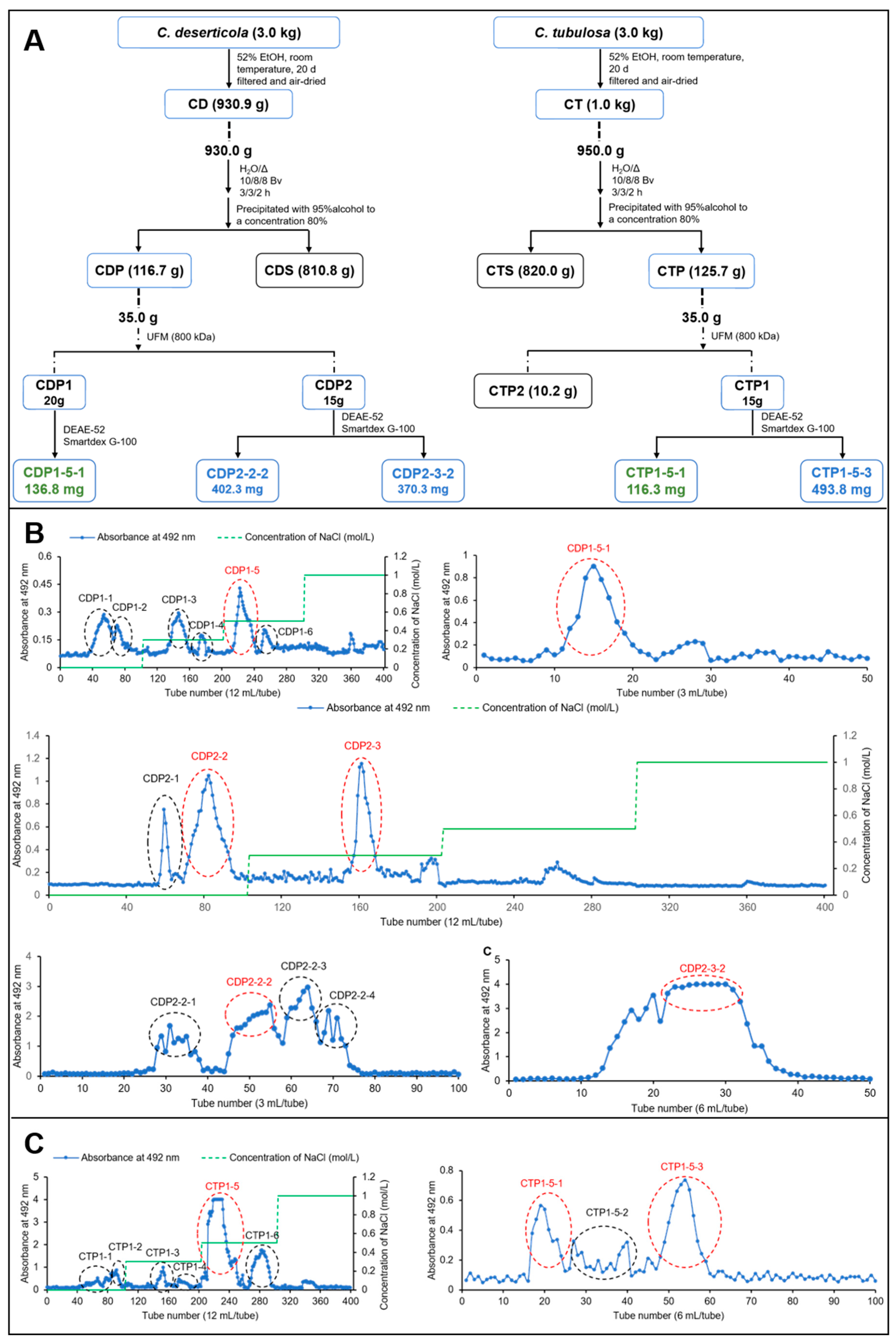 4.2. Extraction and Purification of the Glycans from C. deserticola and C. tubulosa