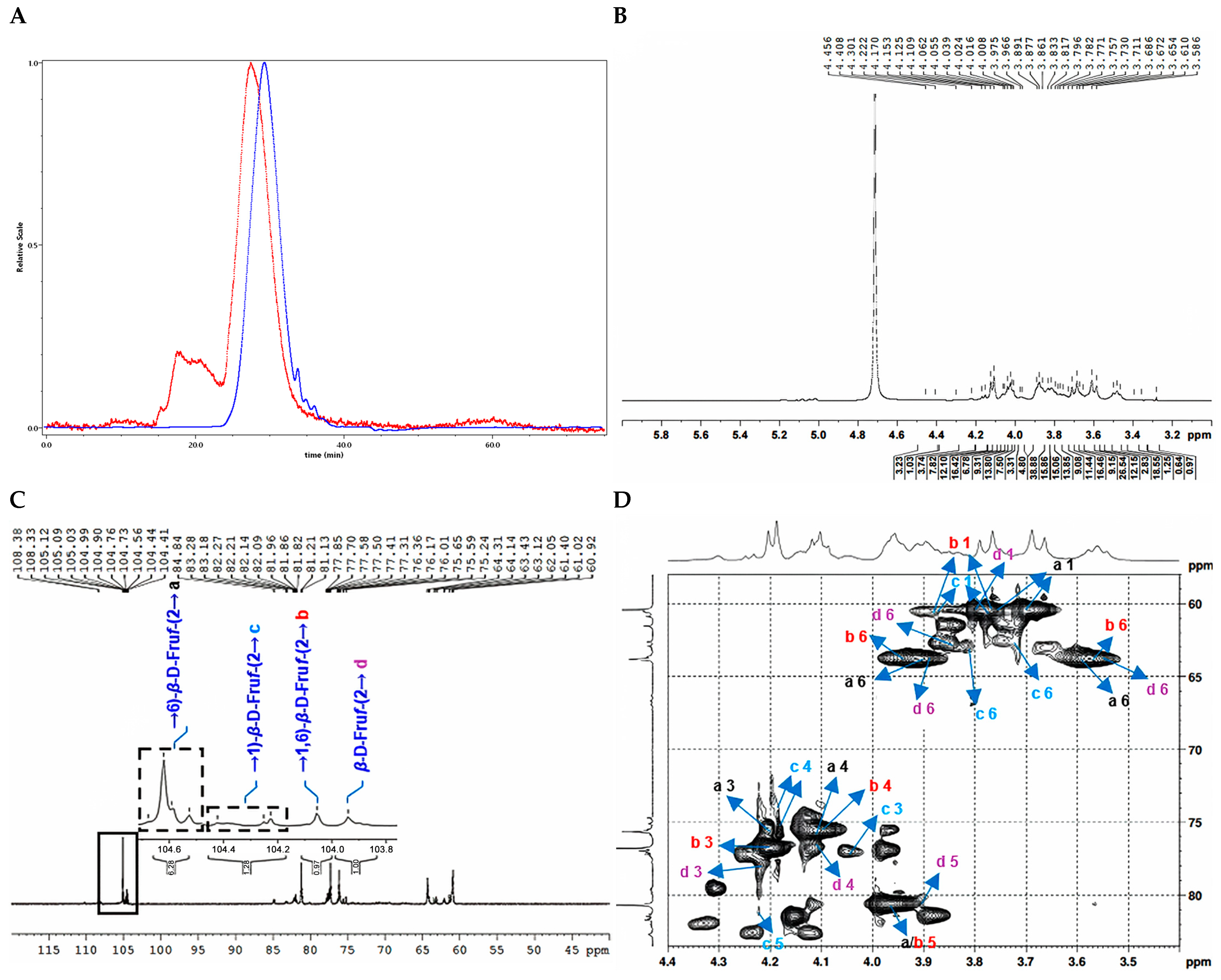 | → 1,6)-β-D-Fruf-(2 → b | 3.77, 3.87 | — | 4.21 | 4.10 | 3.97 | 3.57, 3.95 |