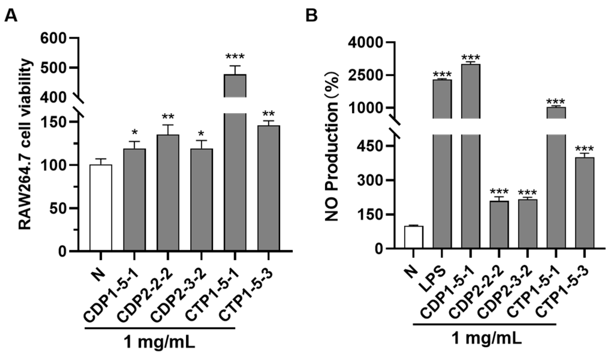 4.4. Regulation of NO Production in Macrophage by CDP1-5-1, CDP2-2-2, CDP2-3-2, CTP1-5-1, and CTP1-5-3