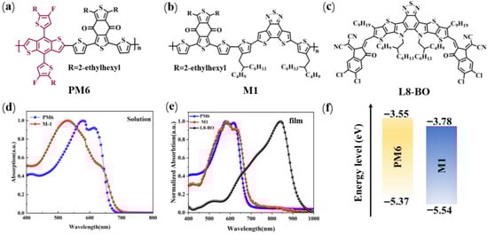 (a) The structures of (a) PM6, (b) M1, and (c) L8-BO. UV-vis absorption curve of polymer donors and acceptor (L8-BO) for (d) solution and (e) film state. (f) The energy level of PM6 and M1 was obtained by using Gaussian 16 software at the B3LYP/6-31G(d,p) level based on DFT.