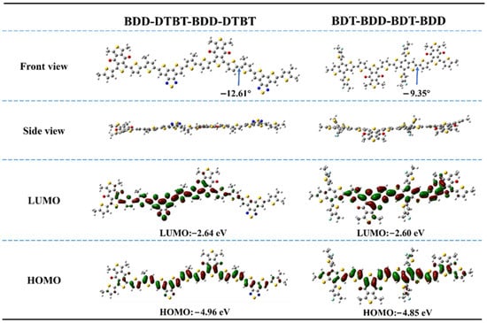 DFT calculation of PM6-based dimer model BDT-BDD-BDT-BDD and M1-based dimer model BDD-DTBT-BDD-DTBT for optimized geometries and energy levels.