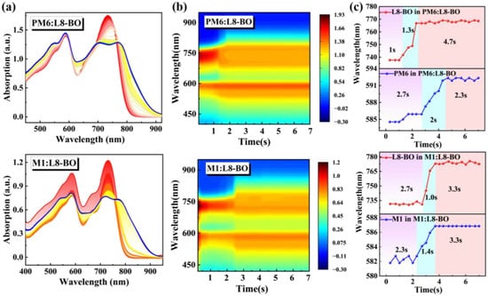 (a) In situ UV-vis absorption of PM6:L8-BO and M1:L8-BO blend films. (b) Two-dimensional time-resolved UV-vis absorption spectra of PM6:L8-BO and M1:L8-BO blend films. (c) The peak position evolution as a function of time for PM6:L8-BO and M1:L8-BO blend films.