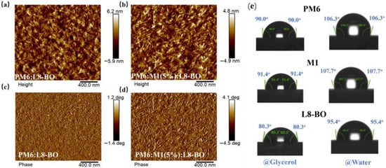 Height images of (a) PM6:L8-BO and (b) PM6:M1(5%):L8-BO-based blend films. Phase images of (c) PM6:L8-BO and (d) PM6:M1(5%):L8-BO-based blend films. (e) Contact angle measurement of PM6, M1, and L8-BO.