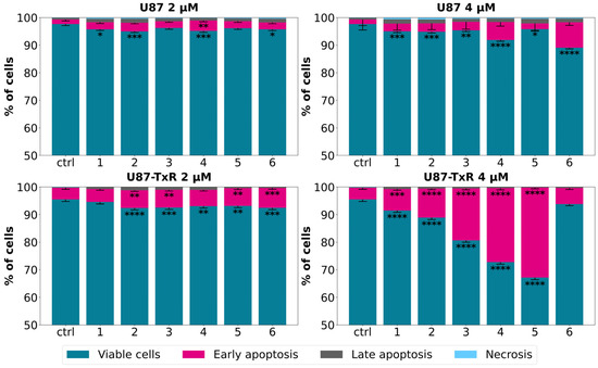 Cell death analysis in glioblastoma cells after treatment with adamantane–sclareol hybrids. Cell death was assessed with AV/PI staining in U87 and U87-TxR cells after 48 h treatment with compounds 1, 2, 3, 4, 5, and 6 at concentrations of 2 µM and 4 µM. The results are presented with as histograms with percentages of viable (AV− PI−), early apoptotic (AV+ PI−), late apoptotic (AV+ PI+), and necrotic (AV− PI+) cells. At least 10,000 events were recorded per sample. Three separate experiments were performed (n = 3). Statistical analysis was executed using GraphPad Prism 8.0.2. via two-way ANOVA and Dunnett’s multiple comparisons test. A statistically significant difference between the treated samples and the untreated control is indicated as follows: * p ≤ 0.05, ** p ≤ 0.01, *** p ≤ 0.001, **** p ≤ 0.0001.