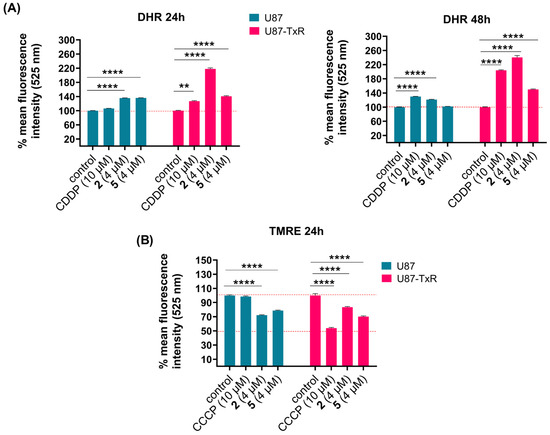 To assess whether compounds 2 and 5 affect ROS levels in U87 and U87-TxR cells, we measured the intracellular superoxide anion using dihydroethidium (DHE), peroxynitrite anion, and H2O2 using dihydrorhodamine 123 (DHR) via flow cytometry. The results obtained after 24 h and 48 h treatments are presented as the mean percentage of fluorescence intensity relative to the untreated control set at 100% (Figure 3A and Figure S4). Cisplatin (CDDP) was used as a positive control. DHE analysis showed no significant changes in intracellular superoxide anion levels (Figure S4). After DHR staining, U87 cells showed slight or no increase in H2O2 and peroxynitrite anion levels over the 24 h and 48 h treatments with both compounds (Figure 3A). However, changes were more evident in the MDR glioblastoma cell line. An increase in DHR fluorescence was observed after treatment with 2 and 5 at both time points (Figure 3A). The most pronounced increase in ROS levels was induced by 2 after 48 h treatment (Figure 3A). Since excessive ROS production can trigger mitochondrial dysfunction, we next assessed whether oxidative stress was accompanied by changes in mitochondrial membrane potential using tetramethylrhodamine ethyl ester (TMRE) staining, also via flow cytometry. Membrane potential was measured following 24 h treatment with 4 µM of 2 and 5 in U87 and U87-TxR cells. Carbonyl cyanide m-chlorophenyl hydrazine (CCCP), a known mitochondrial oxidative phosphorylation uncoupler, was used as a positive control. TMRE fluorescence decreased in both cell lines after treatment with 2 and 5, indicating loss of mitochondrial membrane potential (Figure 3B). It is worth noting that both positive controls, CDDP and CCCP, achieved more potent effects in MDR U87-TxR cells than in sensitive U87 cells.