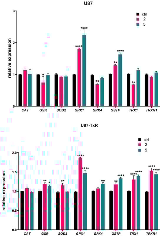Changes in the mRNA expression of antioxidant-related genes induced by 2 and 5 in U87 and U87-TxR cell lines. Quantitative RT-PCR analysis of CAT, GSR, SOD2, GPX1, GPX4, GSTP, TRX1, and TRXR1 mRNA expression in U87 and U87-TxR cells treated for 24 h with 2 and 5. Expression levels were normalized to the housekeeping gene ACTB and are presented relative to untreated control cells set at 1. Data represent the mean ± SEM from three independent experiments. Statistical analysis was performed using two-way ANOVA followed by Sidak’s multiple comparisons test; statistically significant difference between the treated samples vs. control: * p ≤ 0.05, ** p ≤ 0.01, **** p ≤ 0.0001.