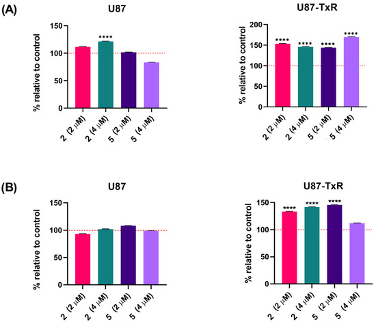 TrxR1 and ASK1 protein expression in U87 and U87-TxR cell lines following treatment with adamantane–sclareol hybrids. (A) TrxR1 and (B) ASK1 protein expression was assessed after 48 h treatment with 2 and 5 at concentrations of 2 µM and 4 µM. Data are presented as percentage relative to untreated control (100%, red dashed line), with statistical significance to the untreated control **** p < 0.0001. Statistical analysis was performed using one-way ANOVA followed by Dunnett’s post hoc test.