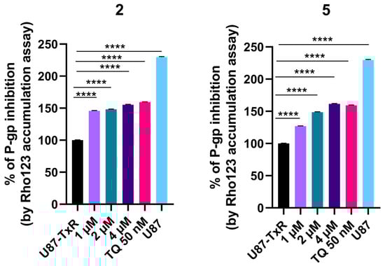 Concentration-dependent effect of 2 and 5 on P-gp activity. Percent of P-gp inhibition, expressed as an increase in Rho123 accumulation, relative to the Rho123 accumulation in U87-TxR cells set at 100%. TQ (50 nM) was used as a reference compound. Sensitive U87 cells are presented as positive control for Rho 123 accumulation. Statistical analyses were performed using one-way ANOVA followed by Dunnett’s multiple comparison test, **** p < 0.0001.