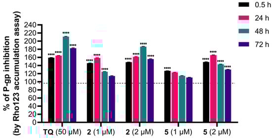 Time-dependent intracellular accumulation of Rho123 in MDR glioblastoma cells treated with 2 and 5. Cells were treated with compounds 2 and 5 at concentrations 1 µM and 2 µM. TQ (50 nM) was used as a reference compound for P-gp inhibition. Intracellular Rho123 fluorescence was measured after 0.5 h, 24 h, 48 h, and 72 h of treatment. Data are presented as the percentage of P-gp inhibition, expressed as an increase in Rho123 accumulation, with 100% set according to the untreated U87-TxR cells (black dashed line). At least 10,000 events were recorded per sample. Data are expressed as mean ± SEM of three independent experiments (n = 3). Statistical analysis was performed using two-way ANOVA followed by Dunnett’s multiple comparison test, **** p < 0.0001.