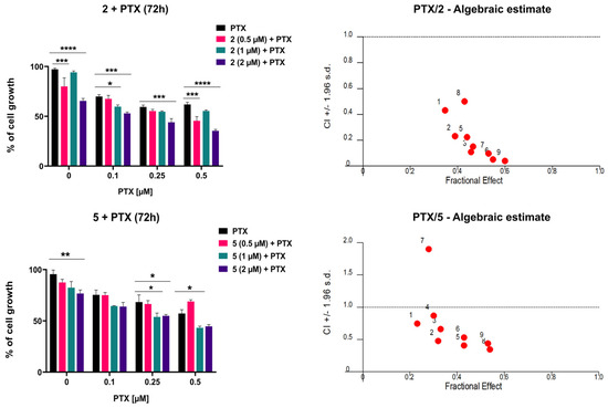 The combined effects of 2 and 5 with PTX in U87-TxR cells. Cells were treated for 72 h with increasing concentrations of PTX, alone and in combination with compound 2 or 5. Cell viability was assessed by MTT assay. Results are presented as mean values ± SEM, obtained from three independent experiments (n = 3). Statistical analysis was performed by two-way ANOVA, comparing combination treatments to PTX alone. Statistical significance compared to untreated control cells is indicated as follows: * p ≤ 0.05, ** p ≤ 0.01, *** p ≤ 0.001, **** p ≤ 0.0001. The interactions between adamantane–sclareol hybrids and PTX were analyzed by CalcuSyn software. The results are shown in a fraction-affected CI graph. Values of CI < 1 point to a synergistic effect, CI values close to 1 indicate an additive effect, while CI > 1 indicates antagonism.
