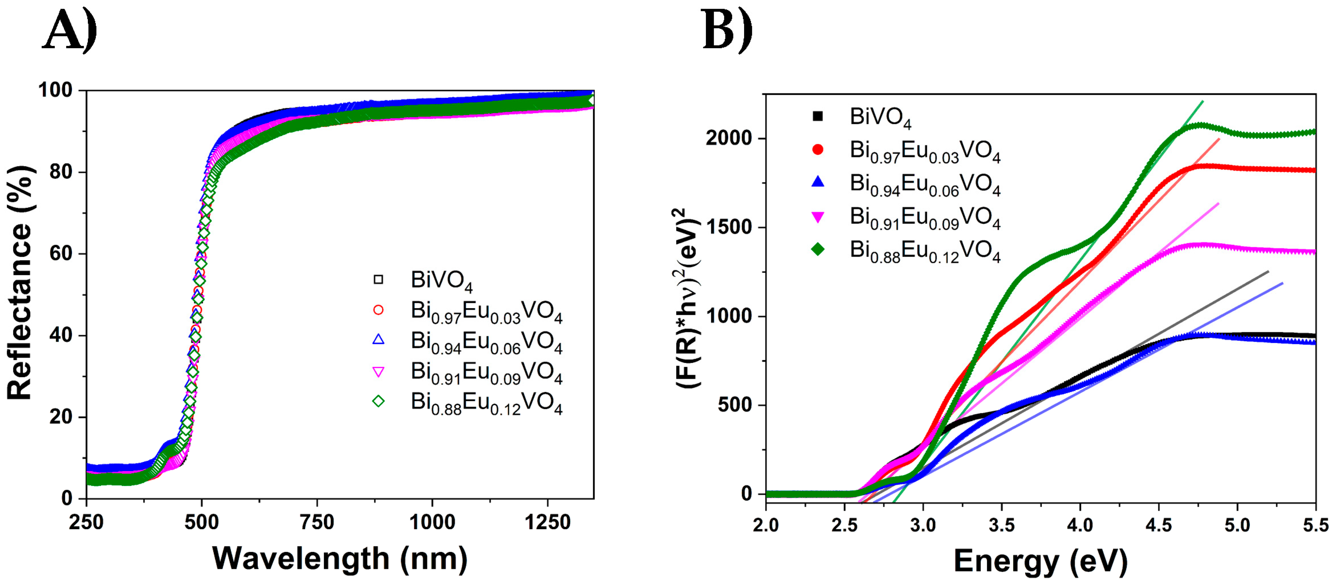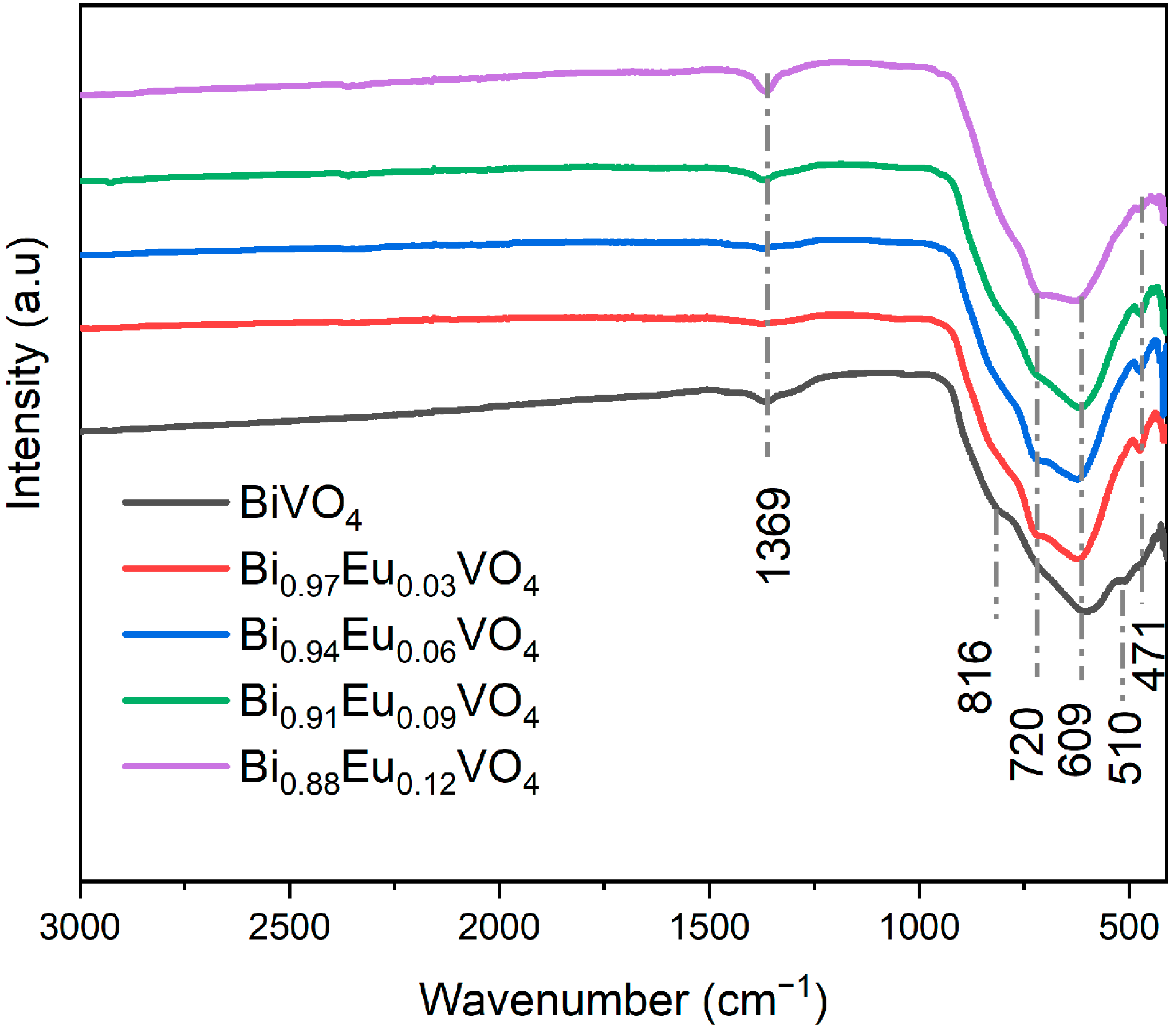 2.2. Optical Properties of the Bi1−xEuxVO4 (x = 0, 0.03, 0.06, 0.09, and 0.12) Samples