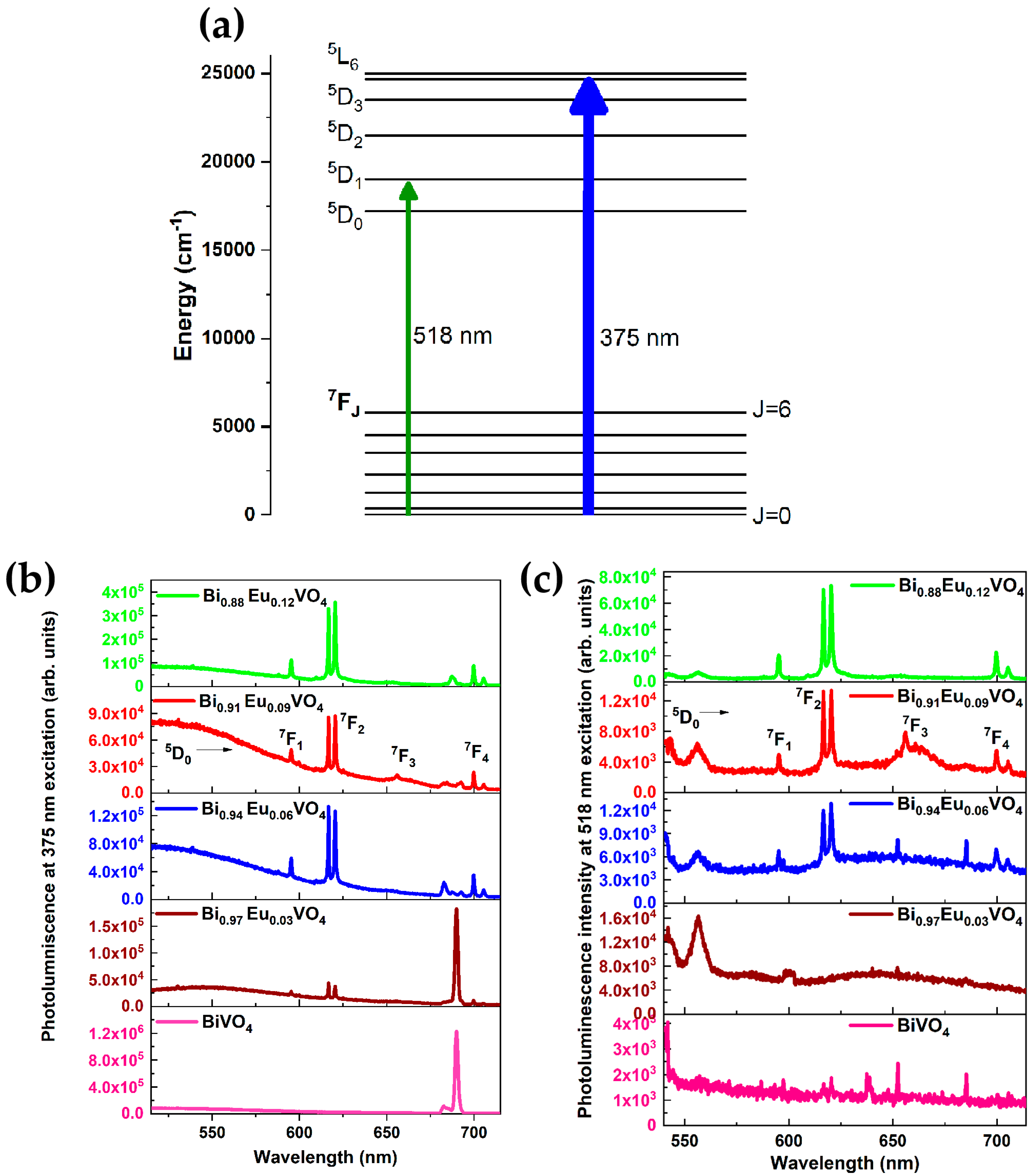 - Wei, D.; Huang, Y.; Bai, J.; Seo, H.J. Manipulating Luminescence and Photocatalytic Activities of BiVO4 by Eu3+ Ions Incorporation. J. Phys. Chem. C 2020, 124, 11767–11779. [Google Scholar] [CrossRef]