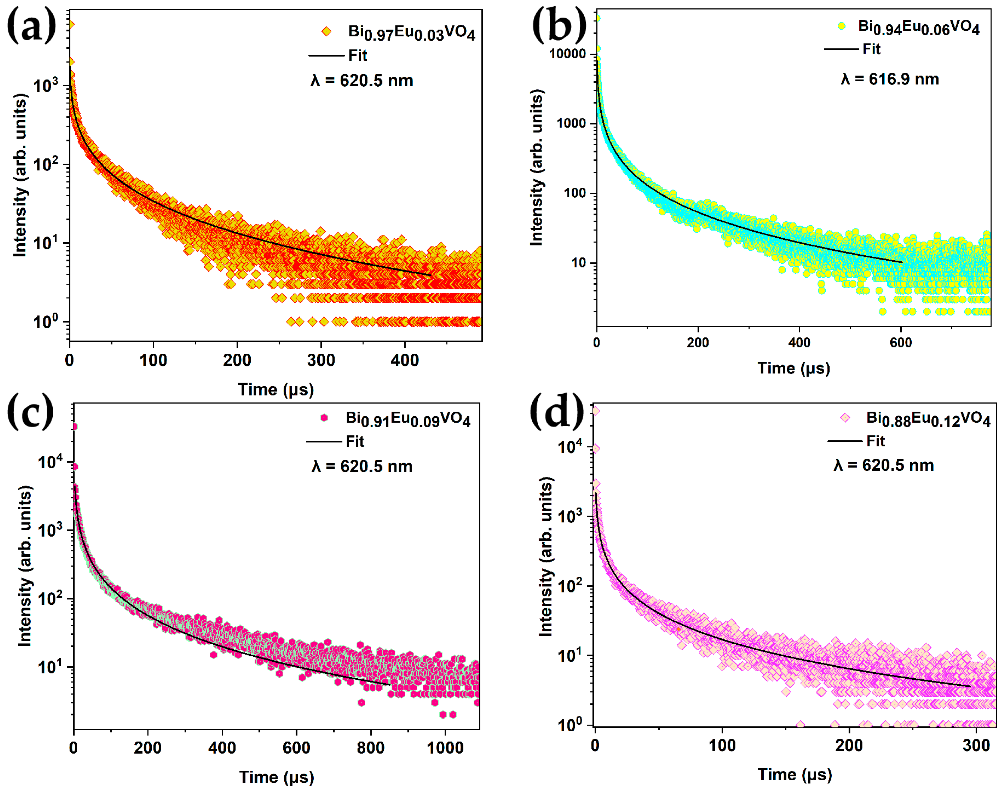 | Eu3+-uniformly-doped BiVO4 NPs * | x = 0.0–0.5 | ms | 5D0 → 7F0,1,2,3,4 PL quenched; cutoff edge 530 nm and ~518 nm. | |