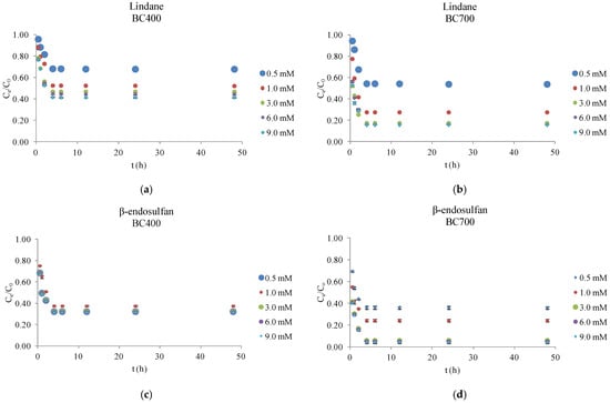 The adsorption behavior observed here aligns with prior findings by Simetić et al. (2025) [14], where wood- and wheat straw-derived BC also reached adsorption equilibrium within 24 h. In that study, removal efficiencies for lindane ranged from 38–42% with BC produced at 400 °C, and up to 56% at 700 °C. For β-endosulfan, the removal reached 78% with wheat straw BC at 400 °C and 84% at 700 °C. Although corn cob BC exhibited slightly lower removal efficiencies in the present study, the overall trends were comparable, particularly the enhanced performance of BC produced at higher pyrolysis temperatures. These results reinforce the conclusion that both feedstock type and pyrolysis temperature significantly influence adsorption efficiency. Similar conclusions were reported by Kang et al. (2022) [16], who showed that adsorption performance is strongly influenced by the structural evolution of BC during pyrolysis. In our study, differences in adsorption behavior between BC400 and BC700 are consistent with the observed changes in BET surface area and elemental composition, which reflect the degree of carbonization.