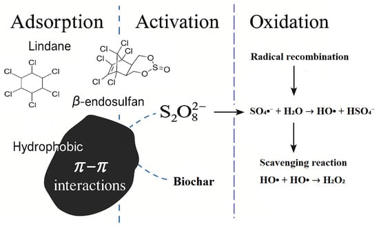 The enhanced degradation of lindane and β-endosulfan in the BC/PS system is attributed to a synergistic mechanism involving both adsorption and catalytic PS activation, as illustrated in Figure 6. The proposed mechanism is consistent with the results of scavenger experiments presented in Section 2.4. BC produced at 700 °C (BC700) offers a large surface area and abundant surface-active sites, enabling efficient pesticide capture and PS decomposition. Due to its aromatic and hydrophobic character, BC700 promotes π–π interactions with the pesticide molecules, facilitating their accumulation on the BC surface. This localized concentration enhances contact between the pesticides and the oxidants. Once adsorbed, PS ions (S2O82−) are activated by the electron-rich regions of the BC, generating a mixture of ROS, primarily SO4•−, HO• and 1O2. These species drive the oxidative degradation of pesticide molecules. At higher PS concentrations, however, scavenging and radical recombination reactions may dominate, leading to decreased efficiency consistent with previously reported findings [14].