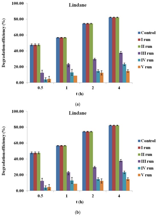 Reusability of corn cob biochar (BC700) in the degradation of (a) lindane and (b) β-endosulfan over five consecutive cycles (initial concentration 100 µg/L, PS 3.0 mM, BC700 0.2 g/L).