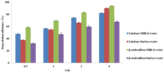 The results presented in Figure 8 show the degradation of lindane and β-endosulfan (initial concentration 100 µg/L) using corn cob-derived BC pyrolyzed at 700 °C as a heterogeneous catalyst for PS activation (3 mM), with contact times ranging from 0.5 to 4.0 h. Experiments were conducted in real surface water and compared with results obtained in Milli-Q water to assess matrix effects.