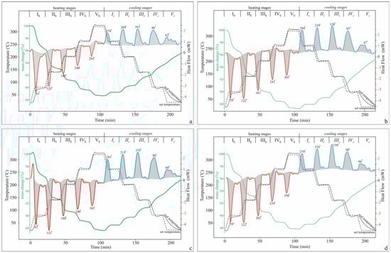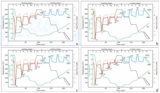 DSC-TG(DTG)-temperature time profiles from the experiment with both four heating and four cooling stages: (a) K-Cpt; (b) Na-Cpt; (c) Ca-Cpt; (d) Mg-Cpt.