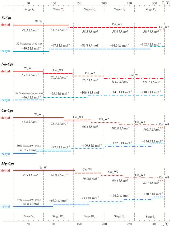For a more detailed characterization of the dehydration, the released water molecules and the molar enthalpy of dehydration are calculated for each temperature interval (Figure 4). The degree of dehydration for different samples varies widely: for samples with predominantly monovalent extra-framework cations, it is 90% (K-Cpt) and 94% (Na-Cpt), while for samples with divalent cations, it is lower (Ca-Cpt—81% and Mg-Cpt—79%). A comparison of the dehydration process occurring within the different stages shows the release of more water molecules in the first stages of dehydration compared to the final stages, regardless of the extra-framework cations (Figure 4a). At the same time, in terms of energy, an increase in the values of the molar enthalpy of dehydration from the Ih to Vh stage is established for all cationic forms, but the specific values and the range of change in the individual stages are strongly influenced by the type of cation (Figure 4b).