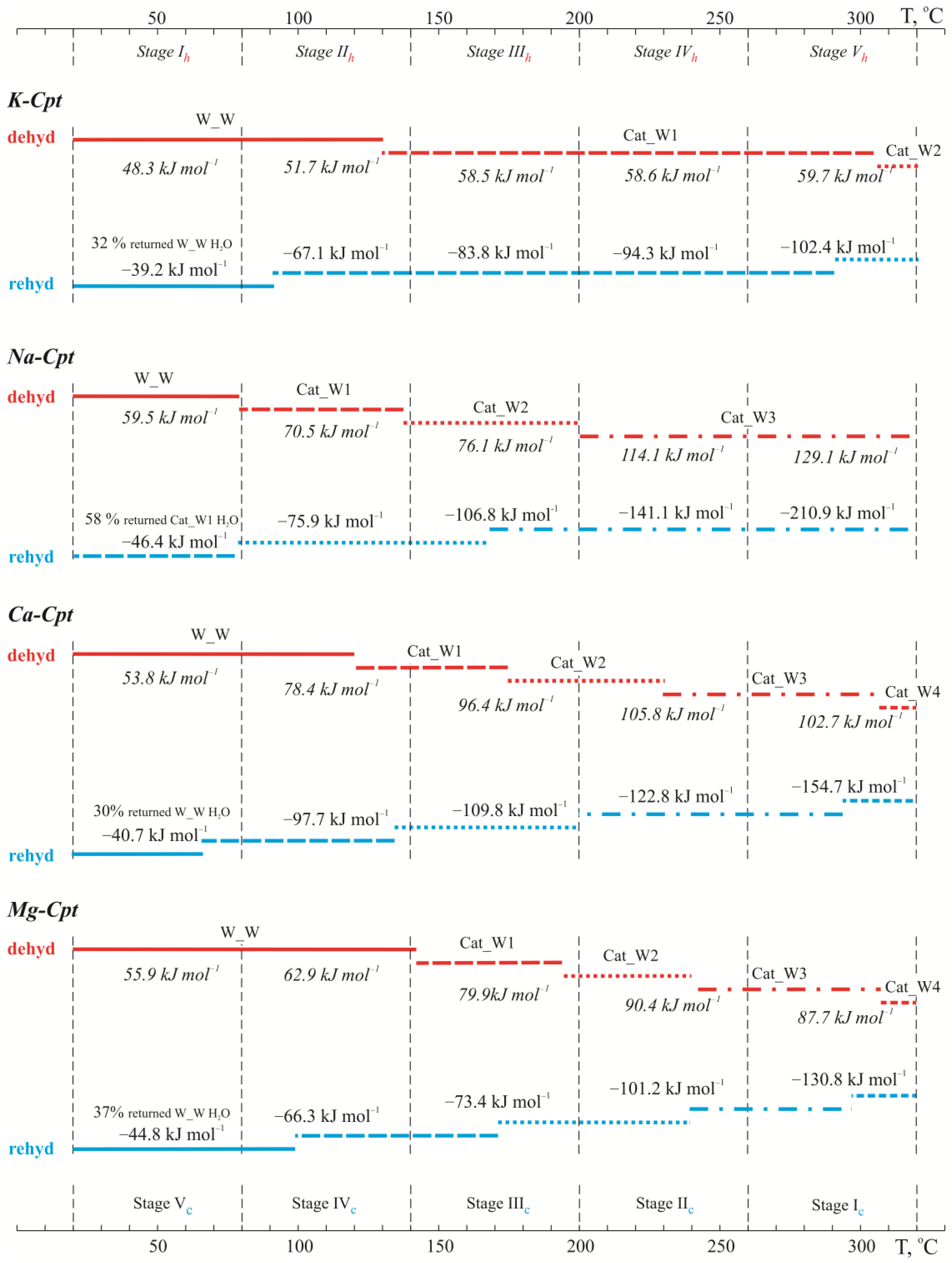 | Stage | Temperature Region, °C | K-Cpt | Na-Cpt | Ca-Cpt | Mg-Cpt | ||||