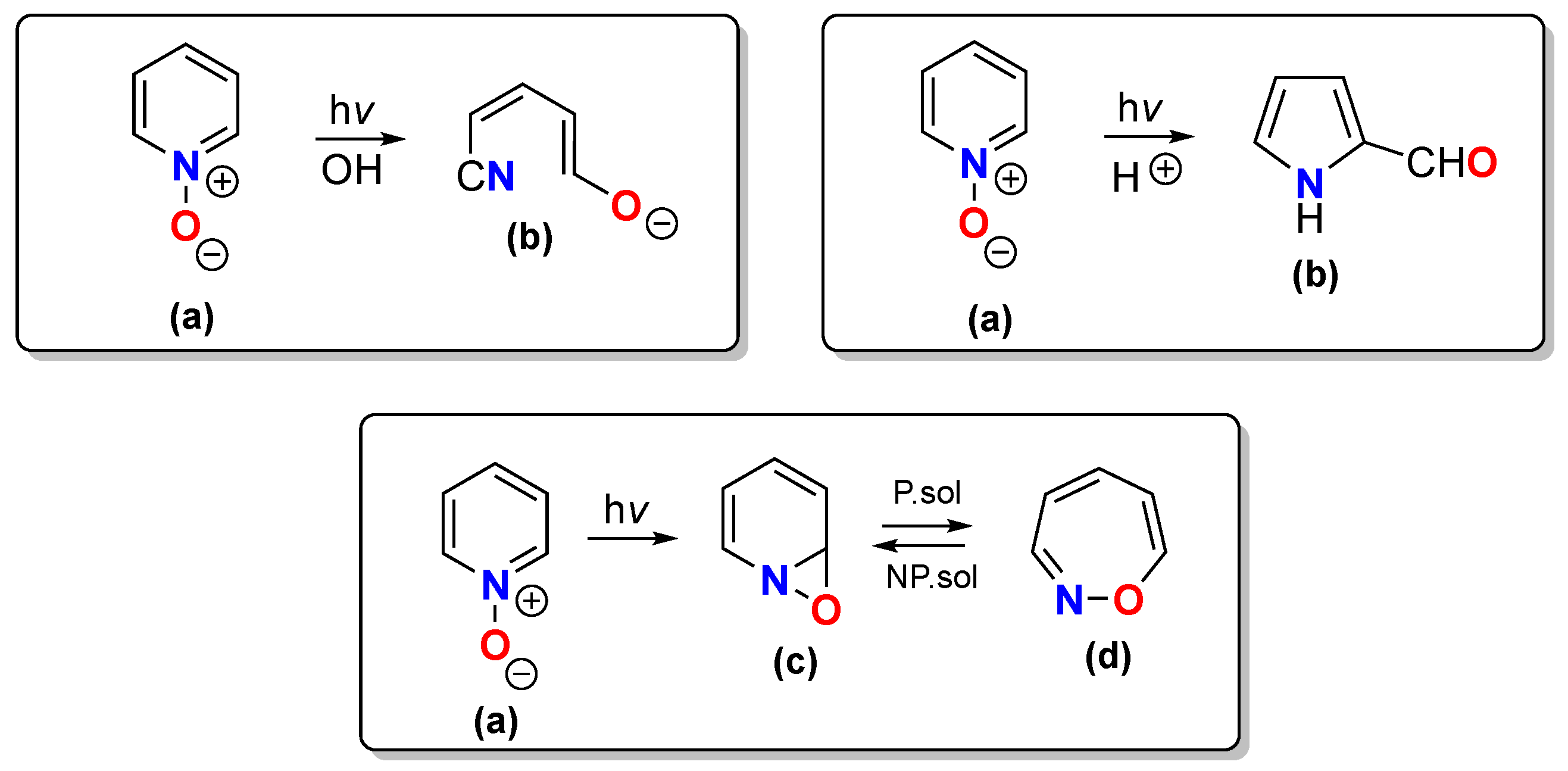 - Poole, J.S. Recent advances in the photochemistry of heterocyclic N-oxides and their derivatives. In Heterocyclic N-Oxides; Springer: Berlin/Heidelberg, Germany, 2017; pp. 111–151. [Google Scholar]