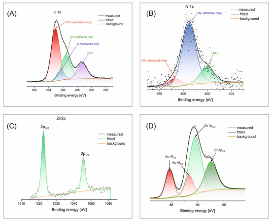 Figure 1 displays high-resolution XPS spectra of C 1s, N 1s, Zn 2p and Au 4f orbital regions. In the C 1s spectrum (Figure 1A), four peaks can be designated at 285 and 288.7 eV, corresponding to C-C and COO− bonds in the naphthalene ring and these positions are consistent with literature data [51], whereas 286.4, 285.7 eV can be attributed to -C=N and -C-N bonds in tetrazole ring, respectively, very similar to positions determined by Bikas et al. [52] for the tetrazole Zn-coordination complex. The carbon content, as determined by XPS analysis, is 36.4% (Table 2), which agrees with that obtained from elemental analysis (35.4%).
