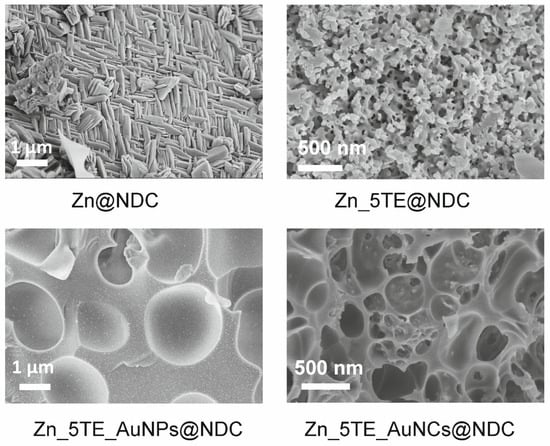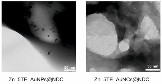 The hybrid materials obtained using gold nanoparticles (AuNPs) and gold nanoclusters (AuNCs) via the “bottle around the ship” strategy differ in morphology, forming spherical particles with internal surfaces coated by nanostructures. It is also visible in TEM images (Figure 3). Furthermore, ultra-small nanoparticles are observed to be embedded inside the pores of the hybrid materials. Additional SEM and TEM images with varying magnifications are presented in the Supplementary Materials (Figures S3 and S4).