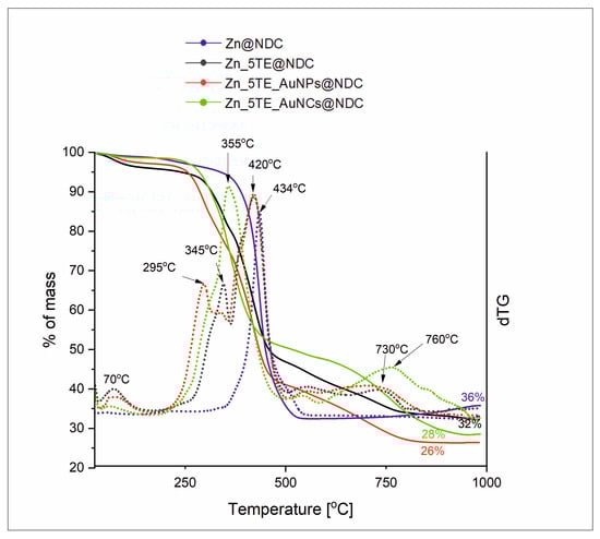 The results of the thermogravimetric analyses (TGA) demonstrated the high thermal stability of the fabricated nanocatalysts. Figure 4 illustrates TGA curves recorded for CPs obtained solely with 1,4-NDC (Zn@NDC), built of two organic blocks (Zn_5TE@NDC) and its hybrids with gold nanoparticles (Zn_5TE_AuNPs@NDC) and nanoclusters (Zn_5TE_AuNCs@NDC) under a nitrogen atmosphere during the heating up to 1000 °C. Also, the corresponding derivatives of these curves are presented as dTG curves. In the case of Zn@NDC, thermal decomposition is a one-step process with a maximum temperature of 434 °C, yielding a solid residue of 36%. The first weight loss for the other studied materials, up to 70 °C, corresponds to the removal of guest water molecules (approximately 10%). When an additional ligand is present in the structure of Zn_5TE@NDC, the process consists of two stages: the first step, at 345 °C, corresponds to its decomposition, and the second peak is similarly located for Zn@NDC. The decay of Zn_5TE_AuNPs@NDC begins at lower temperatures, likely due to 1-octadecanethiol, which acts as a stabilising agent for AuNPs and degrades as the first organic component [61]. Afterwards, the 5-Atz and 1,4-NDC moieties decompose, resulting in around 60% weight loss. Slight weight loss is observed above 500 °C, and the solid residue after decomposition is slightly higher for Zn_5TE@NDC (32%) than for its composite with AuNPs (26%). This can be attributed to the higher organic fraction in Zn_5TE_AuNPs@NDC, which is due to the nanoparticles’ stabilising layer. A similar content of solid residue was determined for Zn_5TE_AuNCs@NDC (28%). However, for this material, a maximum of thermal decomposition begins at a higher temperature than for Zn_5TE_AuNPs@NDC, and a broad peak of the dTG curve with a maximum at 355 °C corresponds to the decay of 5-Atz, 1,4-NDC and cysteine together; the decay of a small fraction of the PEI layer can explain the subsequent broad weight loss [62].