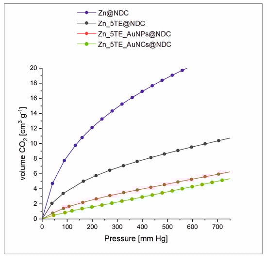 Isotherms of N2 adsorption for Zn5TE@NDC and its composite with AuNPs, recorded at 77 K, are presented in Figure S5. According to Brunauer classification, they are reversible Type-1. Regarding the studied catalytic applications of CO2, its adsorption at 273 K is crucial; we utilise isotherms measured for this gas under these conditions to evaluate its porosity (Figure 5). The Brunauer–Emmett–Teller (BET) surface areas and pore volumes were determined for all the fabricated nanomaterials (Table 3). The highest BET surface area (S0) is observed for the material obtained using only 1,4-NDC as a ligand, at 146 m2 g−1; a two-times lower value was determined for ZnCPs with 5-Atz as the second ligand. The determined surface area for Zn_5TE@NDC is very close to that obtained by Zhao et al. [63] for Zn-MOF. Significantly smaller S0 values were determined for hybrid materials. These changes in porosity can be explained by the fact that gold nanostructures may occupy some of the pores formed in the network. The sizes of pores in the fabricated materials are below 2 nm; thus, all fabricated nanocatalysts can be classified as microporous. For the DFT pore size distribution, see Figure S6.