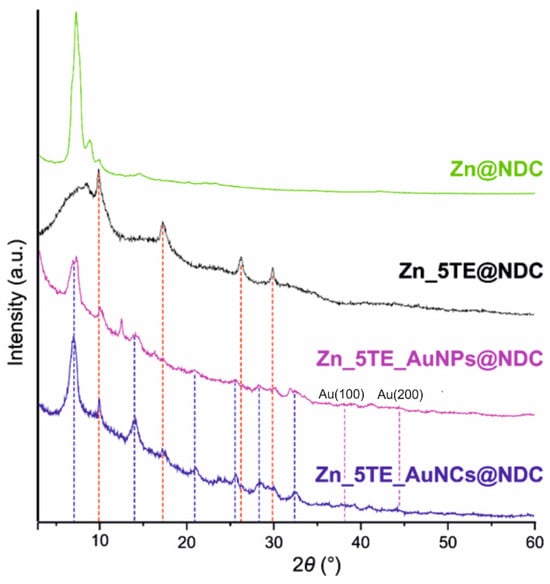In Zn_5TE@NDC and in gold hybrids, at least two phases are observed. The broader, less intense diffraction peaks in Zn_5TE@NDC indicate the presence of an amorphous or poorly crystalline phase that appears to further develop upon the incorporation of gold, whether as nanoparticles or nanoclusters.