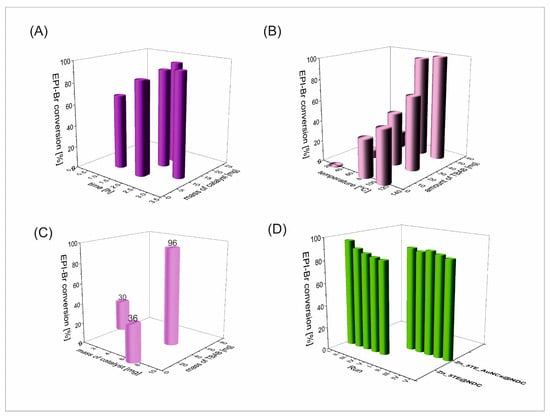 The influence of reaction conditions with Zn_5TE_AuNCs@NDC as a catalyst on the conversion of epibromohydrin (EPI-Br): (A–C); conversion of EPI-Br in five subsequent cycles (D) (2 h, 80 °C, 1.5 MPa CO2, 15 mg of catalysts in the first cycle, 50 mg of TBAB, 14 mmol of EPI-Br).