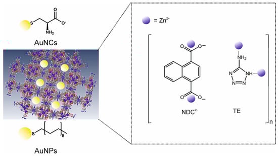 Zinc-based coordination polymers (ZnCPs) were synthesised using two organic building blocks, 1,4-naphthalenedicarboxylic acid (1,4-NDC) and 5-amino-1H-tetrazole (5-Atz), in a self-assembled structure. We employed two methods for synthesis: solvothermal and a more environmentally friendly diffusion-controlled method [50]. The hybrid materials of these polymers with gold nanoparticles (AuNPs) and gold nanoclusters (AuNCs) were fabricated using the “bottle around the ship” strategy [41,42]. Three ligand species build the framework of these materials: deprotonated 1,4-naphthalene dicarboxylic ions (NDC2−), 5-amino-tetrazole (TE) and protonated 5-amino-tetrazole (TE+). Pores of the fabricated coordinated polymers are partially occupied by gold nanostructures (Scheme 1).
