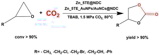 Since Zn_5TE@NDC’s performance was better than Zn@NDC’s, we tested only catalysts based on this polymer in subsequent reactions. For the most active epoxides, such as epibromohydrin and glycidol, the developed catalysts yielded excellent results in very short reaction times (3–4 h). When the Zn_5TE_AuNCs@NDC catalyst was used, 100% glycidol conversion was observed after 4 h. Meanwhile, the application of this catalyst for the fixation of CO2 with epibromohydrin yielded 96% carbonate within 3h, with selectivity approaching 100%. Additionally, high conversions of epichlorohydrin and styrene oxide were achieved using the developed catalysts under the studied conditions, although longer reaction times were required (20 h for epichlorohydrin and 24 h for styrene oxide). It is worth emphasising that the brilliant high selectivity (close to 100%) of these epoxides towards the proper carbonates was achieved.