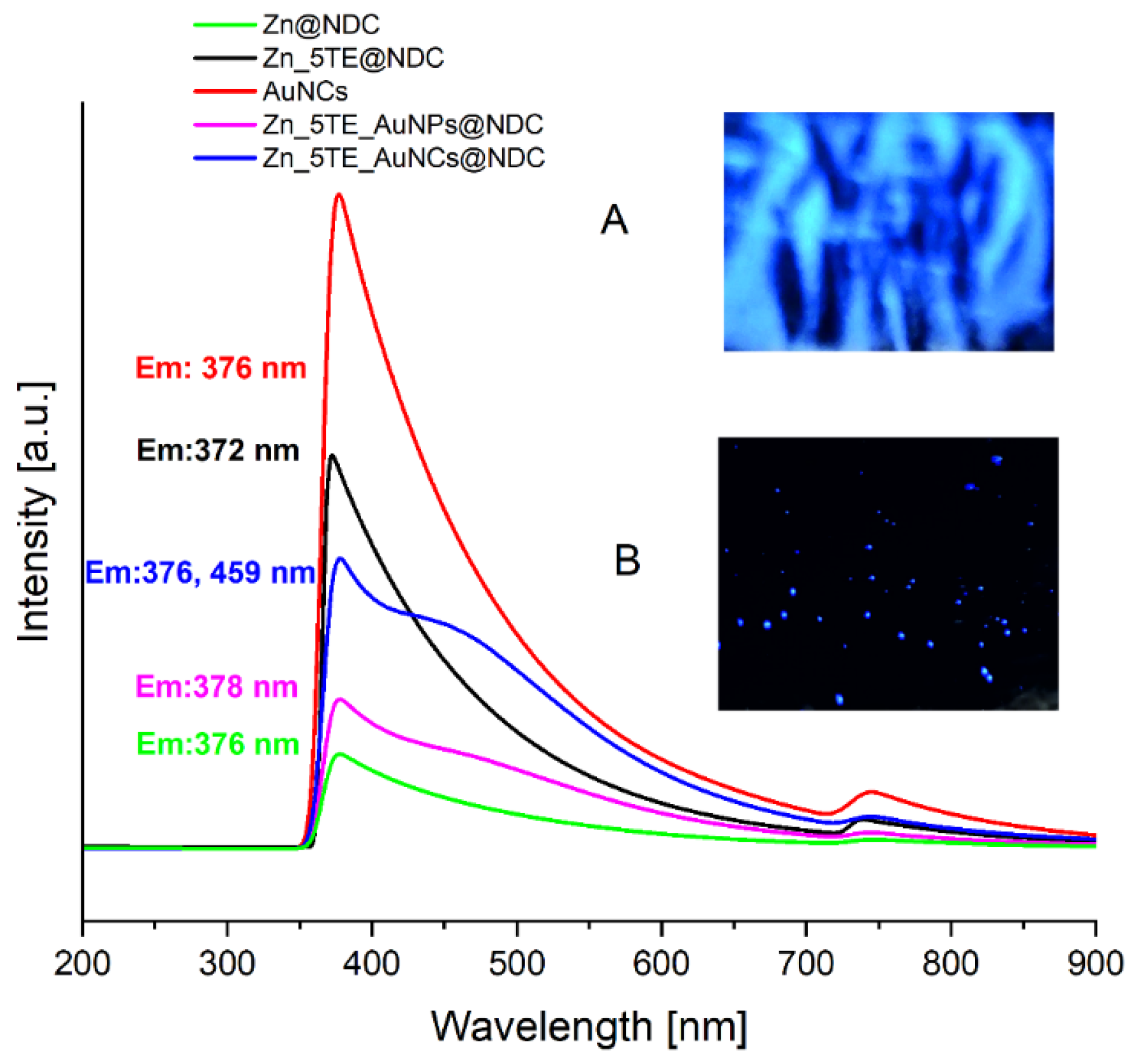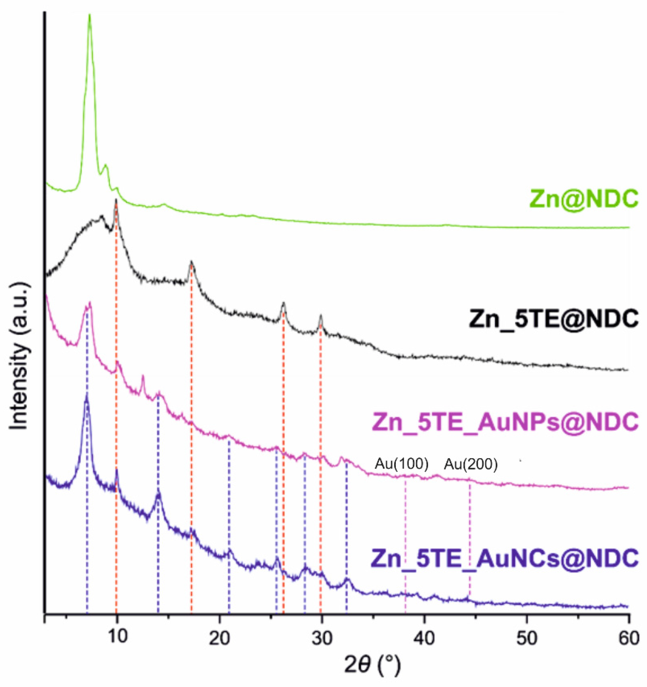 ![]() | ![]() | Zn_5TE@NDC Zn_5TE_AuNPs@NDC Zn_5TE_AuNCs@NDC | 24 | 69 93 94 | 78 97 100 | 775 1020 1080 | 32 42 45 |