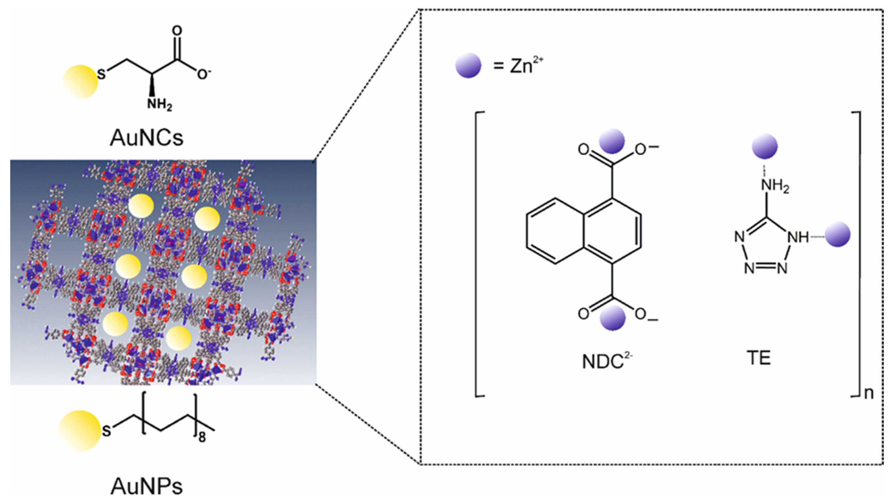![]() | ![]() | Zn@NDC Zn_5TE@NDC Zn_5TE_AuNPs@NDC e Zn_5TE_AuNCs@NDC f | 24 | 48 68 86 90 | n.d. c | 1083 1145 1822 2160 | 45 48 76 90 |