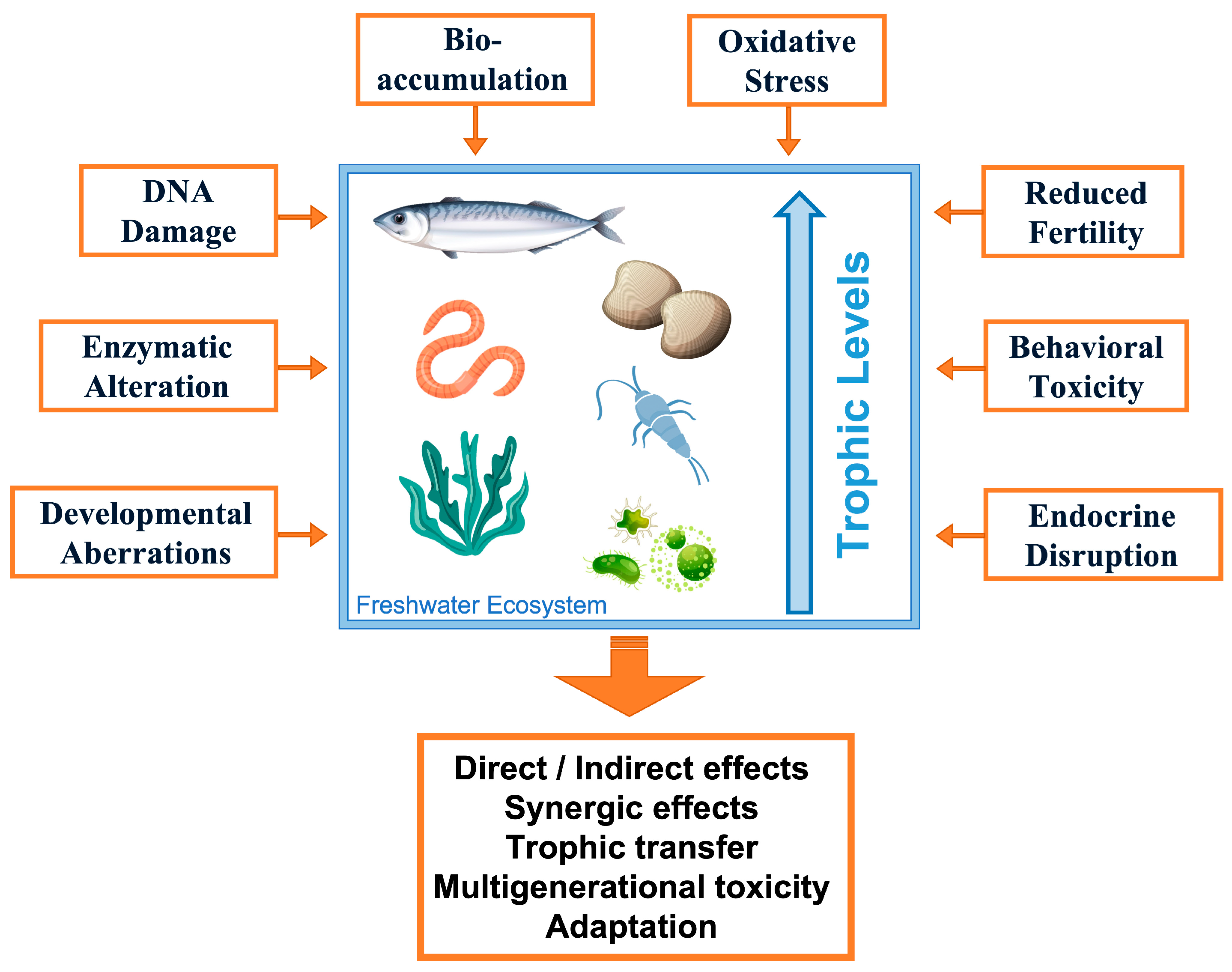- Ockenden, A.; Mitrano, D.M.; Kah, M.; Tremblay, L.A.; Simon, K.S. Impacts of Warming and Nutrient Enrichment on the Fate and Effects of Nanoplastics in a Freshwater Food Web. Nat. Water 2024, 2, 1207–1217. [Google Scholar] [CrossRef]