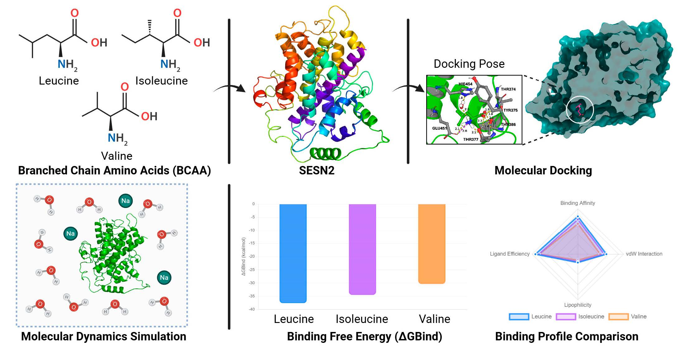 MM/GBSA Binding Free Energy and Component Analysis for BCAA-SESN2 Complexes. All energy values are in kcal/mol and represent the average ± standard deviation from three independent 500 ns MD simulations. ΔGbind is the total binding free energy. ΔEvdW and ΔECoulomb are the van der Waals and electrostatic contributions, respectively. ΔGLipo and ΔGSolvGB are the non-polar and polar solvation free energy terms. EStrainLig is the strain energy of the ligand in its bound conformation.