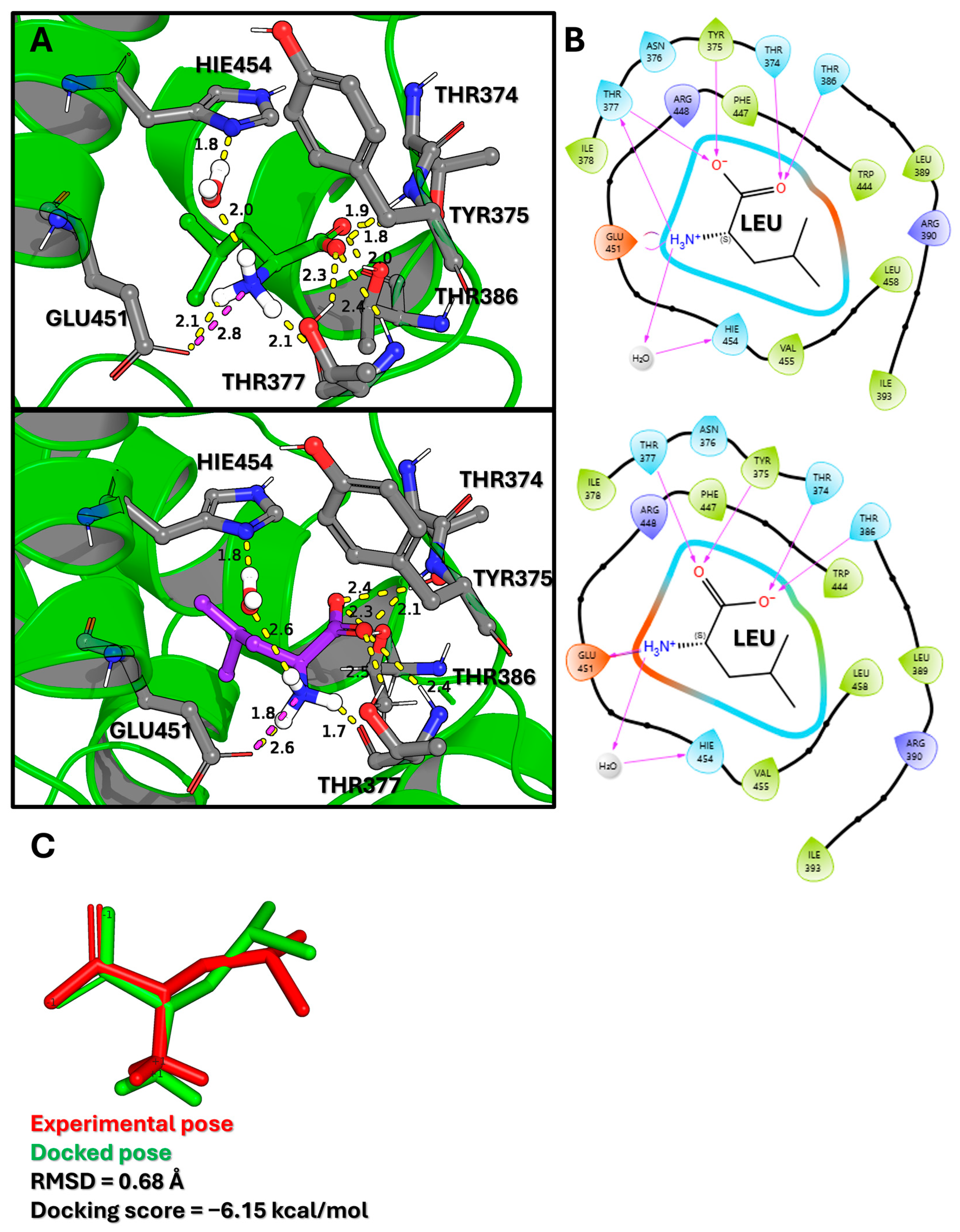 Validation of the Leucine Binding Mode through Molecular Docking. (A) 3D visualization comparing the computationally docked pose of leucine (top) with its experimentally determined crystallographic pose (bottom). Green ribbons denote the SESN2 protein backbone, and grey sticks represent carbon atoms of key interacting residues. Yellow dashed lines indicate hydrogen bonds, with adjacent numbers specifying the interaction distances in Angstroms (Å). (B) Corresponding 2D ligand interaction diagrams for the docked (top) and experimental (bottom) poses. Residue spheres are colored by chemical property: green (hydrophobic), blue (polar), purple (basic), and orange (acidic). Purple arrows indicate hydrogen bond directionality (donor to acceptor). (C) Structural alignment of the experimental (red) and docked (green) leucine poses. The low root-mean-square deviation (RMSD) of 0.68 Å confirms the high accuracy of the docking protocol, while the docking score of −6.15 kcal/mol indicates a favorable theoretical binding affinity.