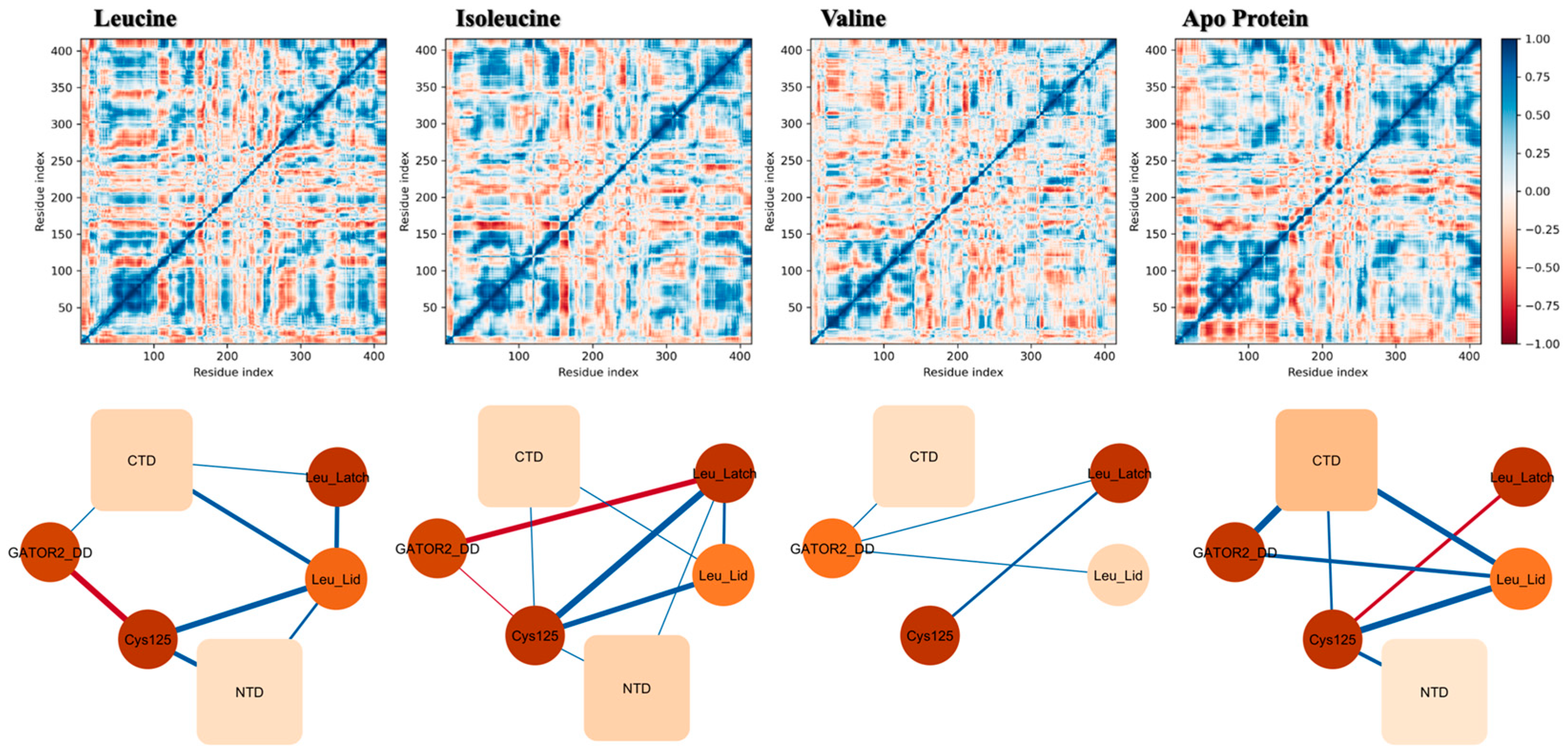 Dynamic Cross-Correlation Analysis Reveals a Leucine-Specific Allosteric Communication Network. (Top Panels) Dynamic cross-correlation matrices (CCMs) showing pairwise residue motion correlation computed from concatenated MD trajectories. Strong positive correlations (coordinated motion) are colored deep blue, whereas strong negative correlations (anti-correlated motion) are deep red. (Bottom Panels) Simplified network models representing the average correlations between key functional domains. Nodes represent the C-terminal domain (CTD), N-terminal domain (NTD), the GATOR2 docking domain (GATOR2_DD), the redox-sensitive cysteine (Cys125), and leucine-binding microdomains (Leu_Lid, Leu_Latch). The thickness of the edges is proportional to the correlation strength (blue for positive, red for negative). The analysis reveals that only leucine binding establishes a strong, fully connected allosteric network, providing a physical pathway for the binding signal to be transmitted to distal functional sites.